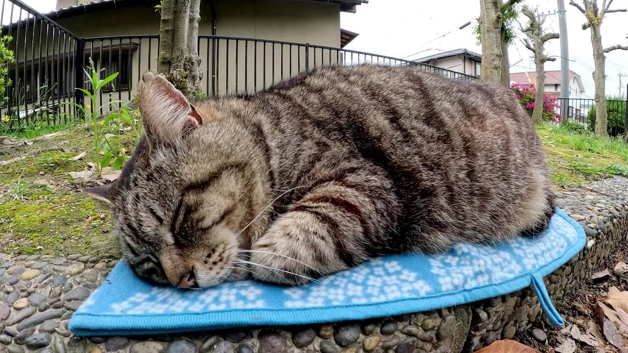 民家の石垣の上でがっちりムッチリボディのキジトラ猫さんが気持ちよさそうにお昼寝をしています。誰かがそこにブランケットを置いてあげています。