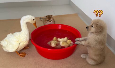 いっぽうお母さんアヒルは、ひよこたちの水浴びを見守り中のところ、子犬、子猫もやってきました。