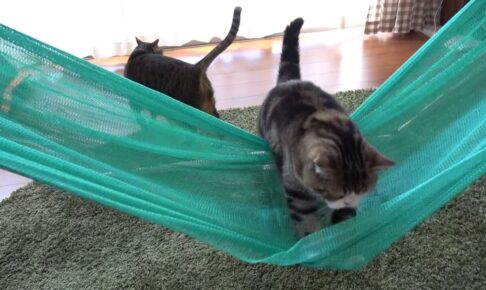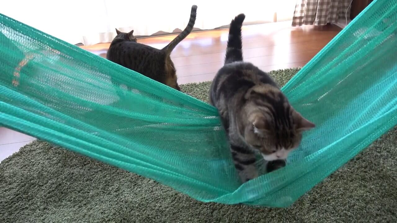 箱に入るなら大得意なまるちゃんですが、ゆらゆらしているハンモックとなると話は別です。相棒のはなちゃんが見守るなか、まるちゃんはハンモックに何度も挑戦します。
