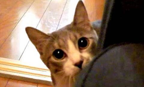 カメラを持っている主さんが物陰に隠れている間に猫さんは素早く前進します。そして顔を出すと猫さんはタイミングよくピタッと止まります。