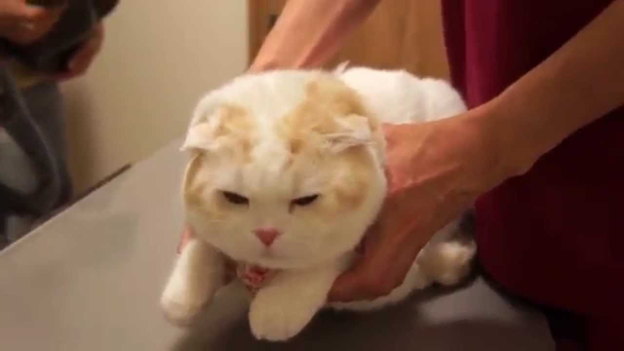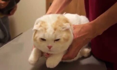 おまんじゅうみたいにまんまるなお顔のスコティッシュフォールドの猫さんが健康診断とワクチン接種のために動物病院にやってきました。