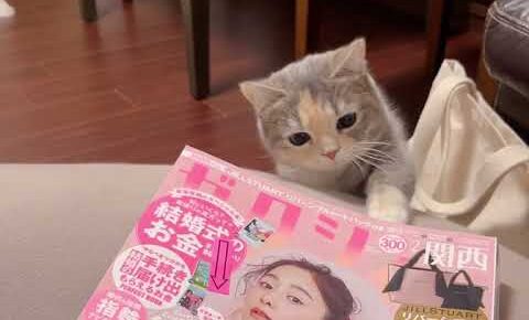 主さんのカメラがパステルカラーの三毛猫の子猫が、ソファに置かれた雑誌に興味を示す様子を捉えています。興味津々で黒目が大きくなっているのがわかりますね。