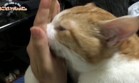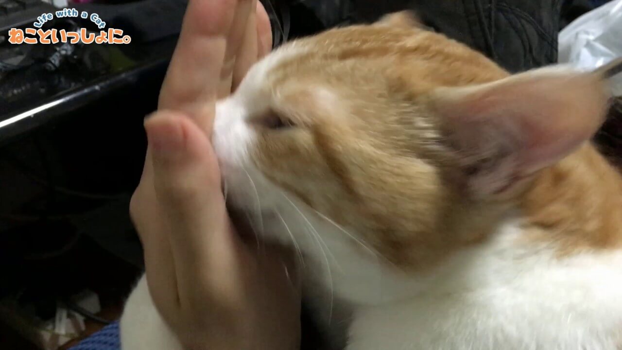 茶白猫の虎徹くんが主さんの手をぺろぺろと一生懸命に舐めています。鼻先をグイグイ押し付けながらぺろぺろ。虎徹くんは甘えたい時には必ずこうして手を舐め始めるのです。