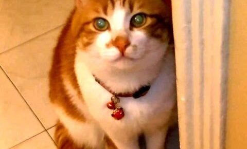 飼い主が鍵を開けながら、ただいま〜と帰宅すると、ドアの隙間から茶トラと白の猫がひょっこり顔を出してお出迎えします。