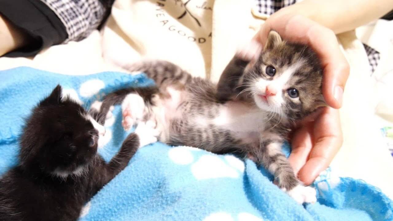 ミルクを飲んだらお母さんの膝の上でまったりする子猫姉妹
