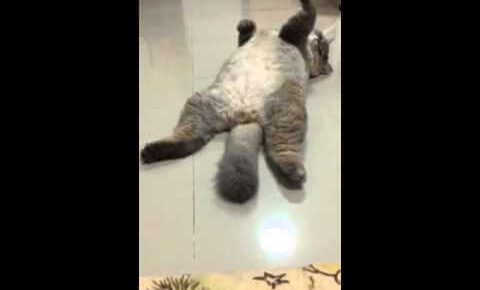 見事な太い尻尾とむっちりとしたボディのテディベアみたいな猫さんが床でヘソ天になってリラックスして寝ています。