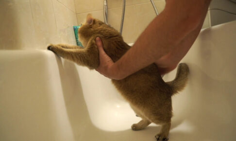 もふもふな猫さんがお父さんにブラッシングをしてもらって気持ち良さそうにしています。なぜかお風呂の浴槽のなかでブラッシングをしてもらっている猫さんです。