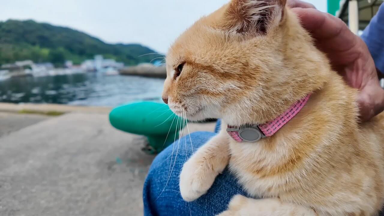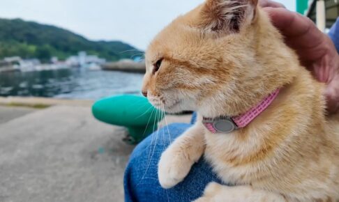 フェリーの出航時間まで、しばらくこの猫さんと一緒に時間を過ごすことにしました。腰をおろすとすぐに猫さんは近づいてきて、膝の上に乗って甘え始めます。