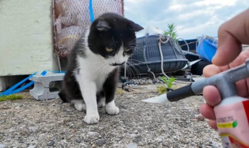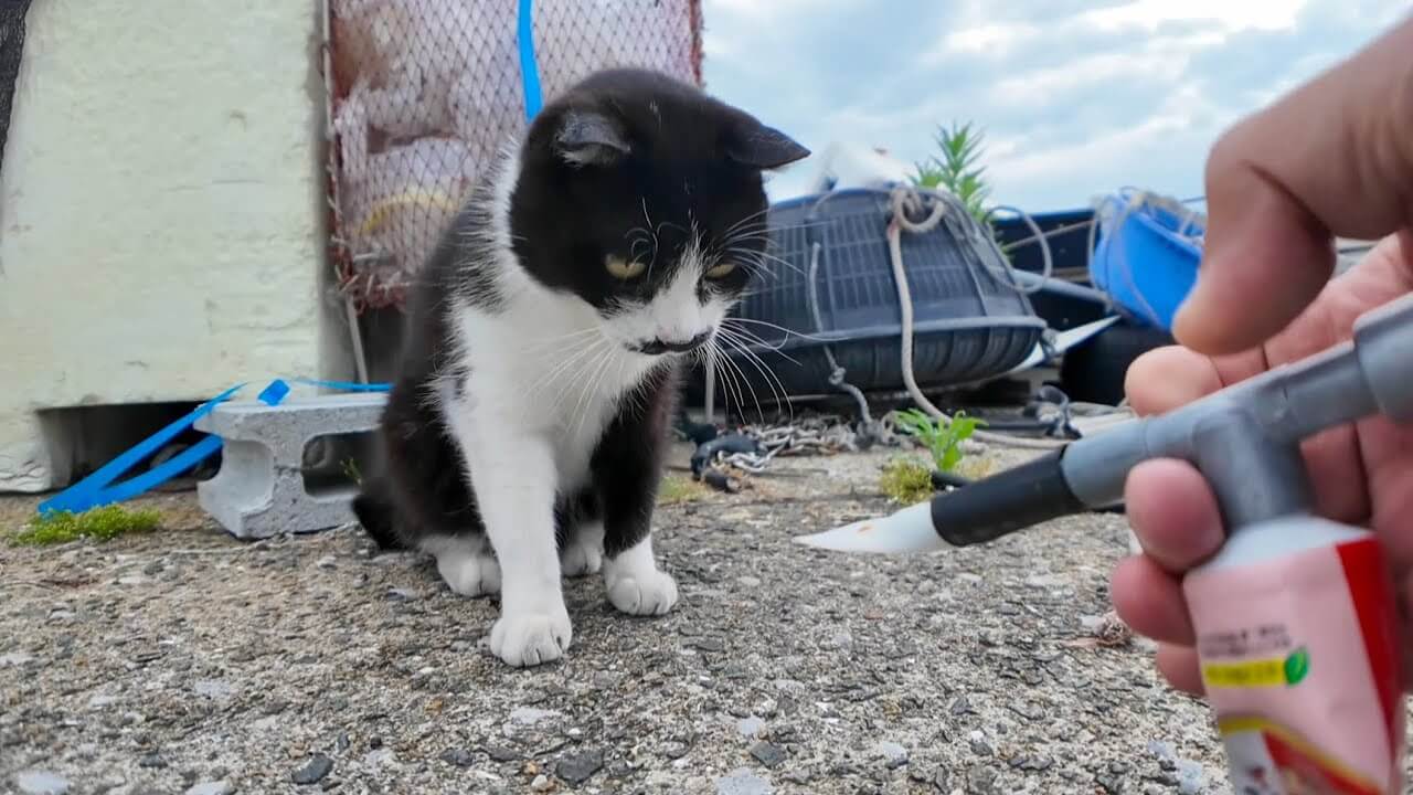 空き地にいた黒白のハチワレ猫さんに、ちゅーるをあげてみます。スプーンに入れたちゅーるを猫さんの口元へそっと伸ばすと、ちょっと匂いを嗅いですぐにぺろぺろと舐め始めました。