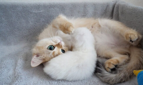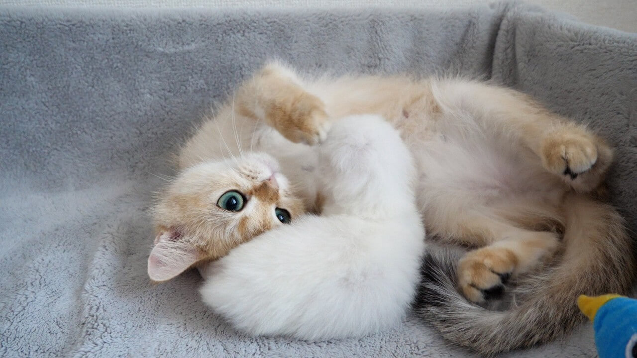 白い赤ちゃん猫が寝転がってゴキゲンな様子でもぞもぞと体を動かしています。見るからに、まだ壊れそうなぐらいな赤ちゃん猫です。
