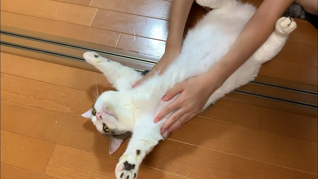 カーペットの上で仰向けになって寝転がっている猫さんがいます。飼い主さんがお腹をさすったりしても全然動じずそのままの格好でひたすらいじられています。