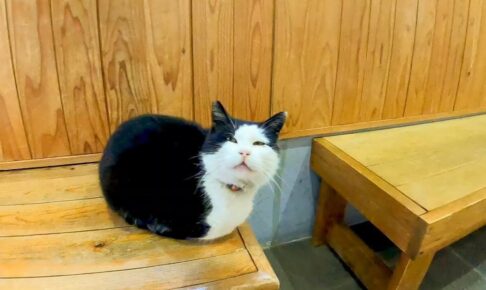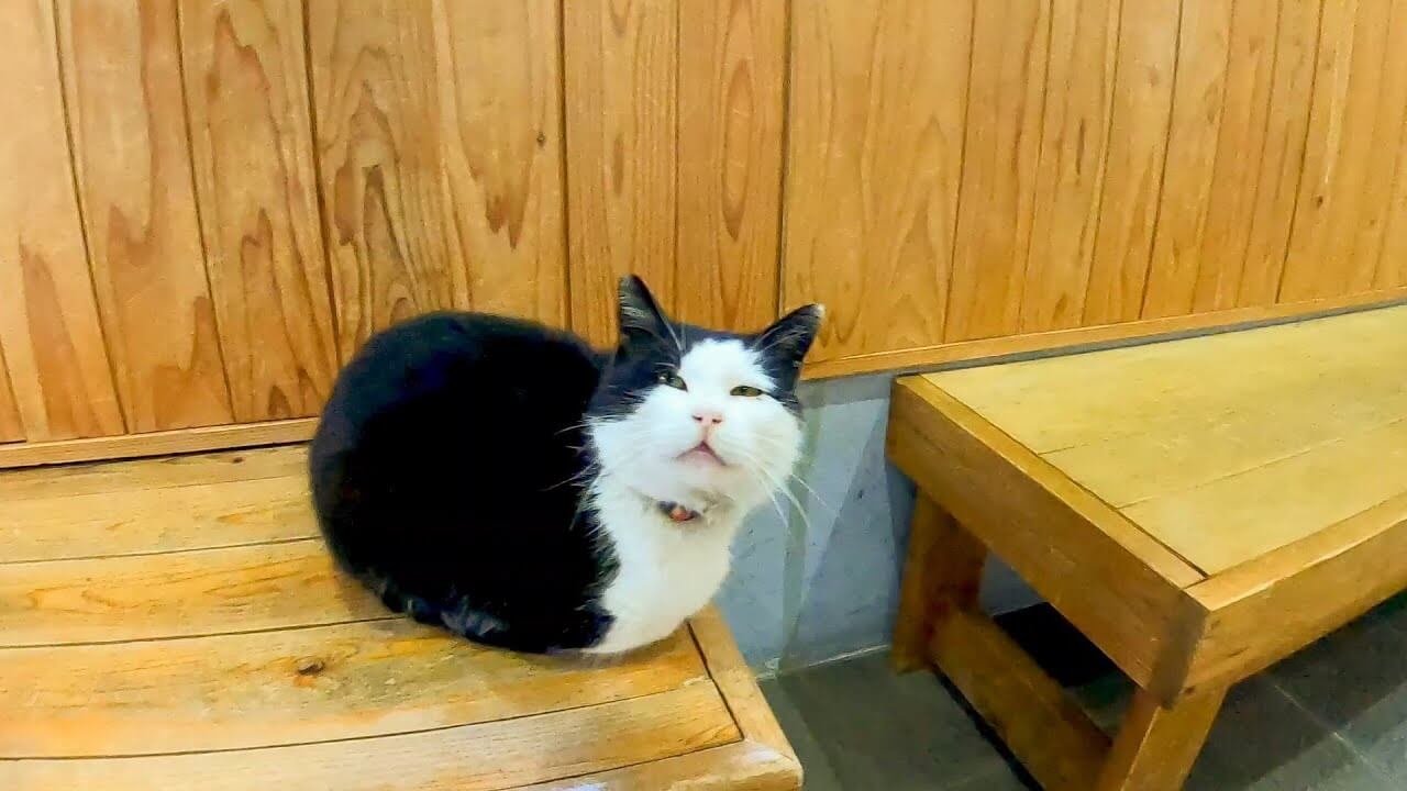 フェリー乗り場の待合室のベンチの上に黒白の可愛い模様の猫さんが箱座りでちんまりとくつろいでいます。