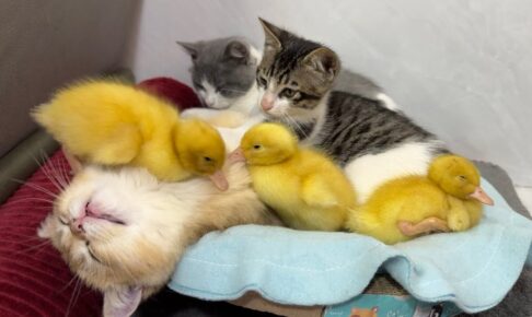 子猫たちもさすがに呆れ顔をしているようですが、優しい性格なのであひるの子たちと仲良くベッドの中であひるの子たちのグルーミングをしてあげたりしています。