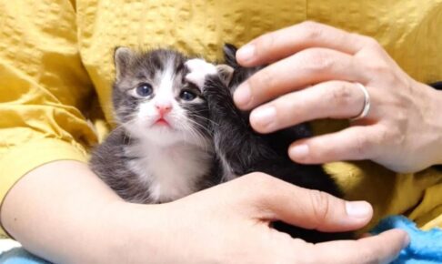 子猫のユメちゃんとチコちゃんが毛布にくるまれながら可愛い声で鳴き始めました。そろそろミルクを頂戴にゃ〜のおねだりの声です。