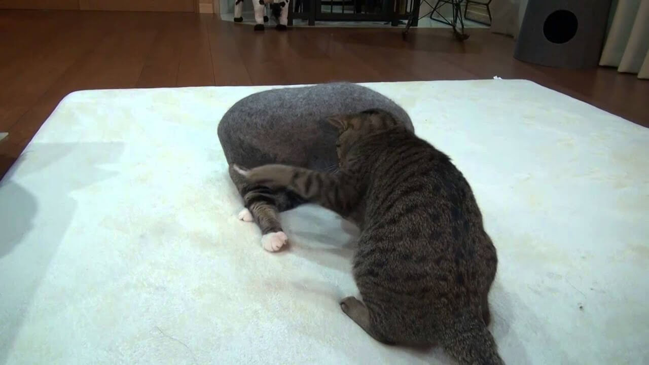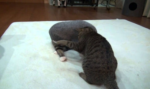 魅惑的なそのベッドに、ちょいちょいと前足でちょっかいを出し始めます。