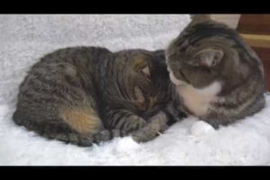 やがて、寄り添った猫がもう一匹の耳元を優しく舐め始めました。