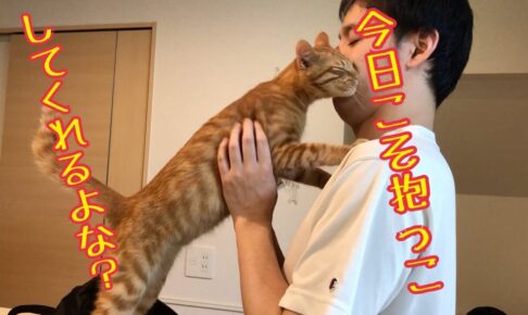 しばらく撫でてもらっていると、きんたがスッと立ち上がりお父さんの体に前足をかけて抱っこのおねだりをしてきました。