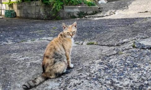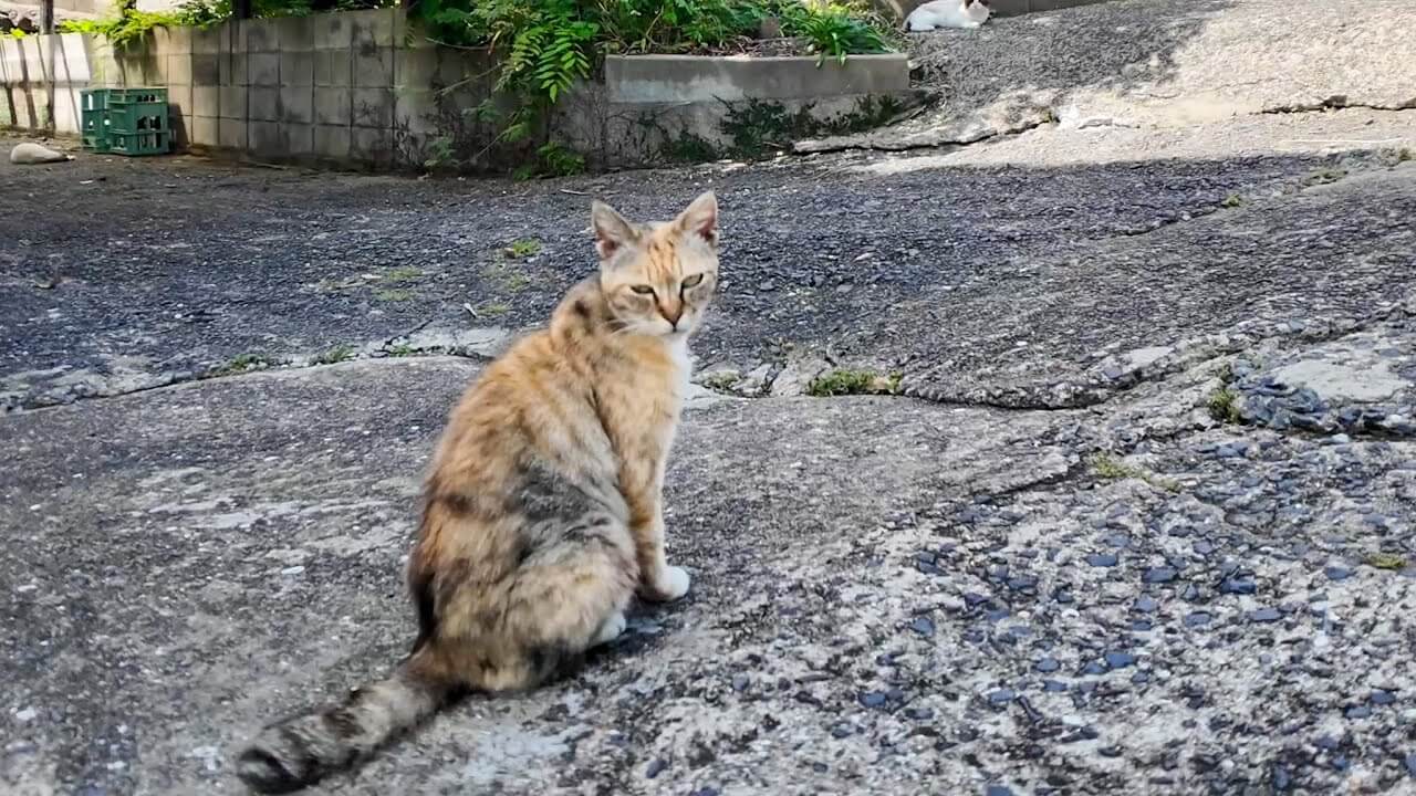 住宅街の路地に猫さんの姿を見つけたので近づいてみました。すると人懐こい猫さんは、すぐに主さんに体を擦り付けてくるように甘え始めます。