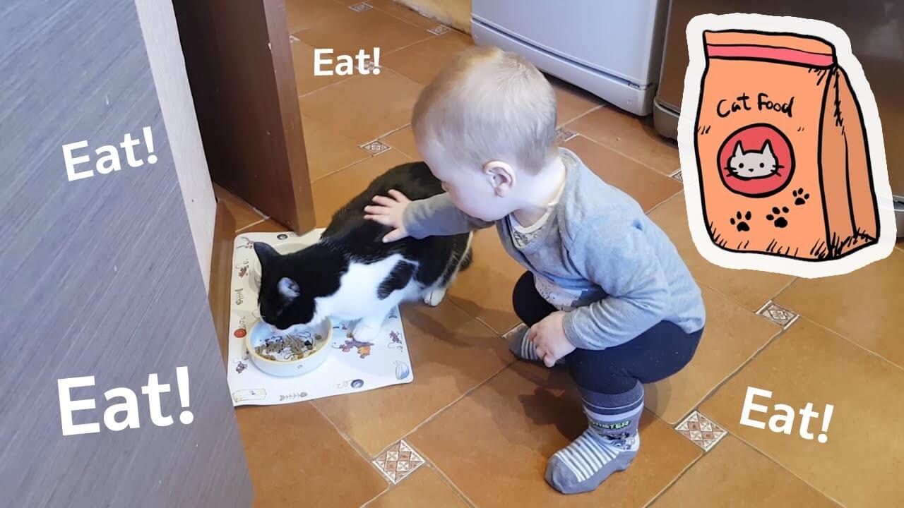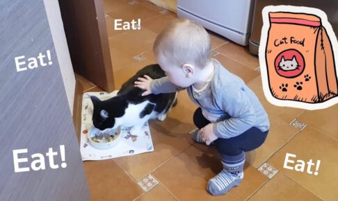 まだ歩き始めて間もない男の赤ちゃんが、愛猫の面倒をしっかり見てあげる頼もしいお兄ちゃんとして接している様子がとてもほのぼのとしています。