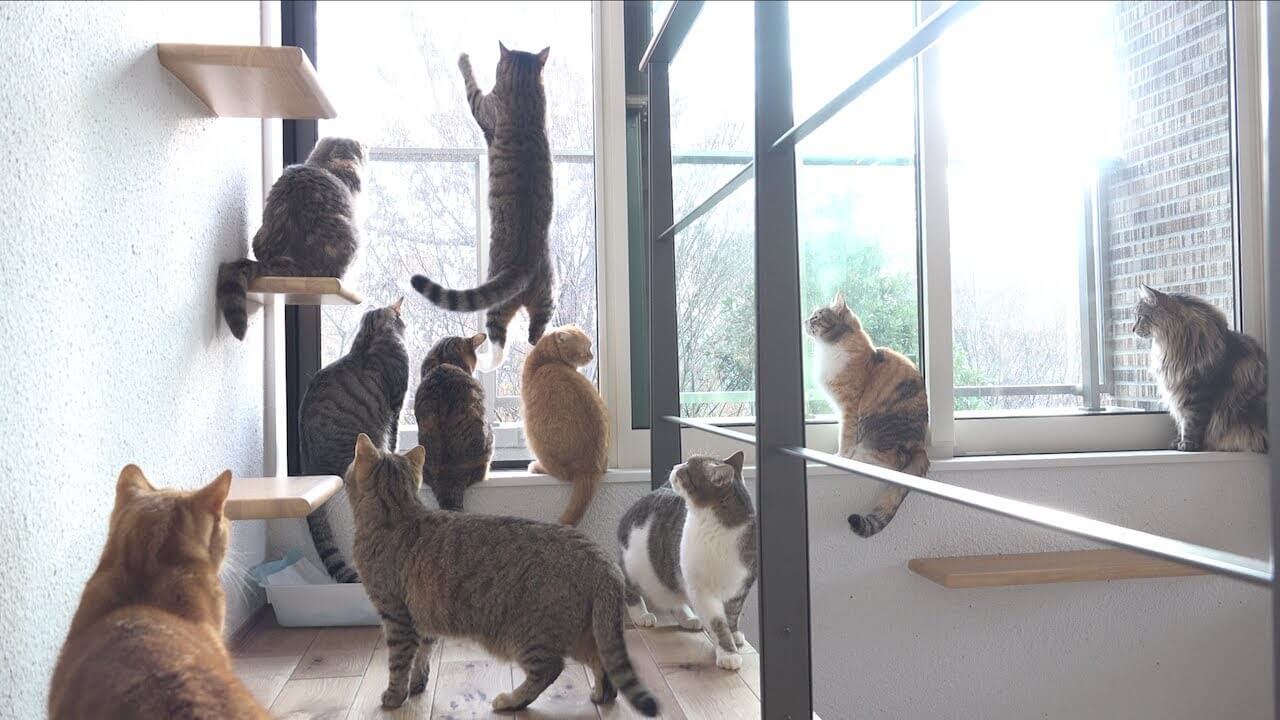 その散歩の間、猫たちは家の中の窓際に集合して外の様子をじっとうかがっています。