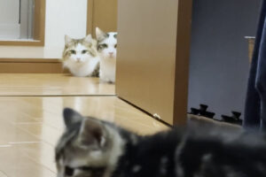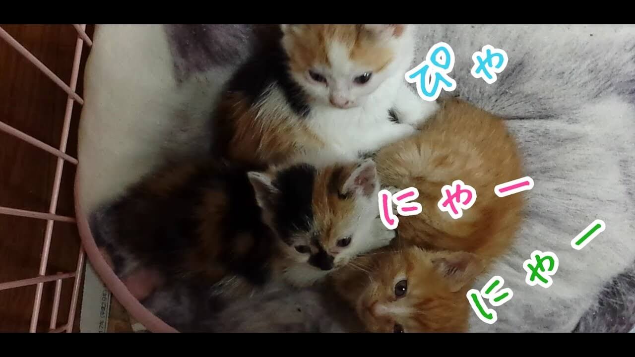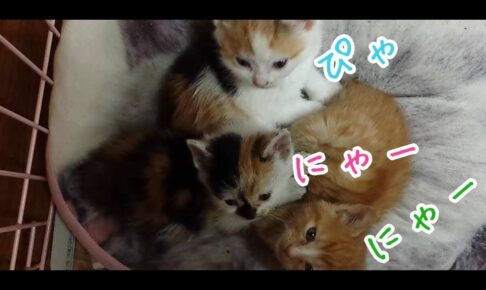 主さんがカメラを向けてきたことに気づいた子猫たちはか細い声で鳴き始めます。