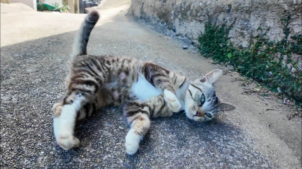 坂道のある住宅街でキジトラ猫さんに遭遇しました。長いしっぽをまっすぐ立てて友好のポーズをして近づいてきます。