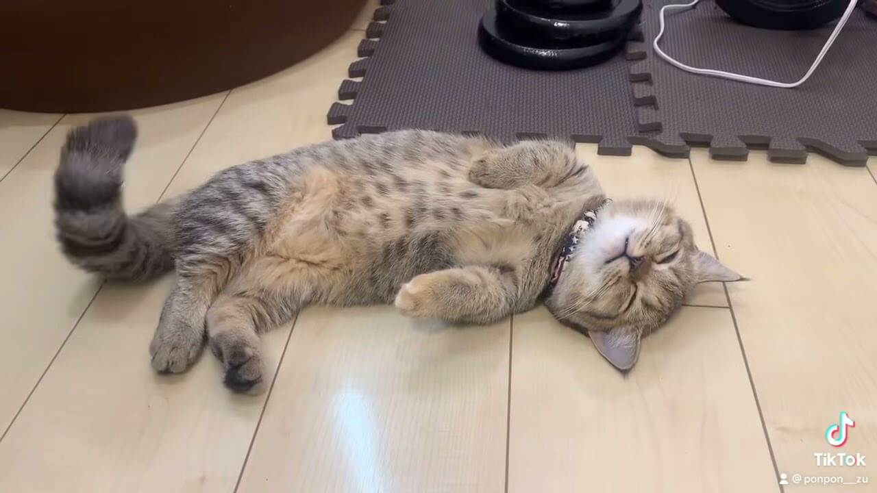 サバトラ猫のポンズちゃんが仰向けに寝転がってポーズを取りながらカメラを見つめている場面から始まります。