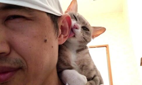 お父さんがトイレに入ると猫のマフィンがかならずやってきてお父さんの肩の上に乗っかって顔をスリスリさせながら甘えにくるのです。