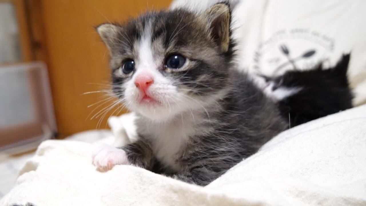 子猫のチコちゃんとユメちゃんが飼い主さんの腕の中で寛いでいる場面から始まります。
