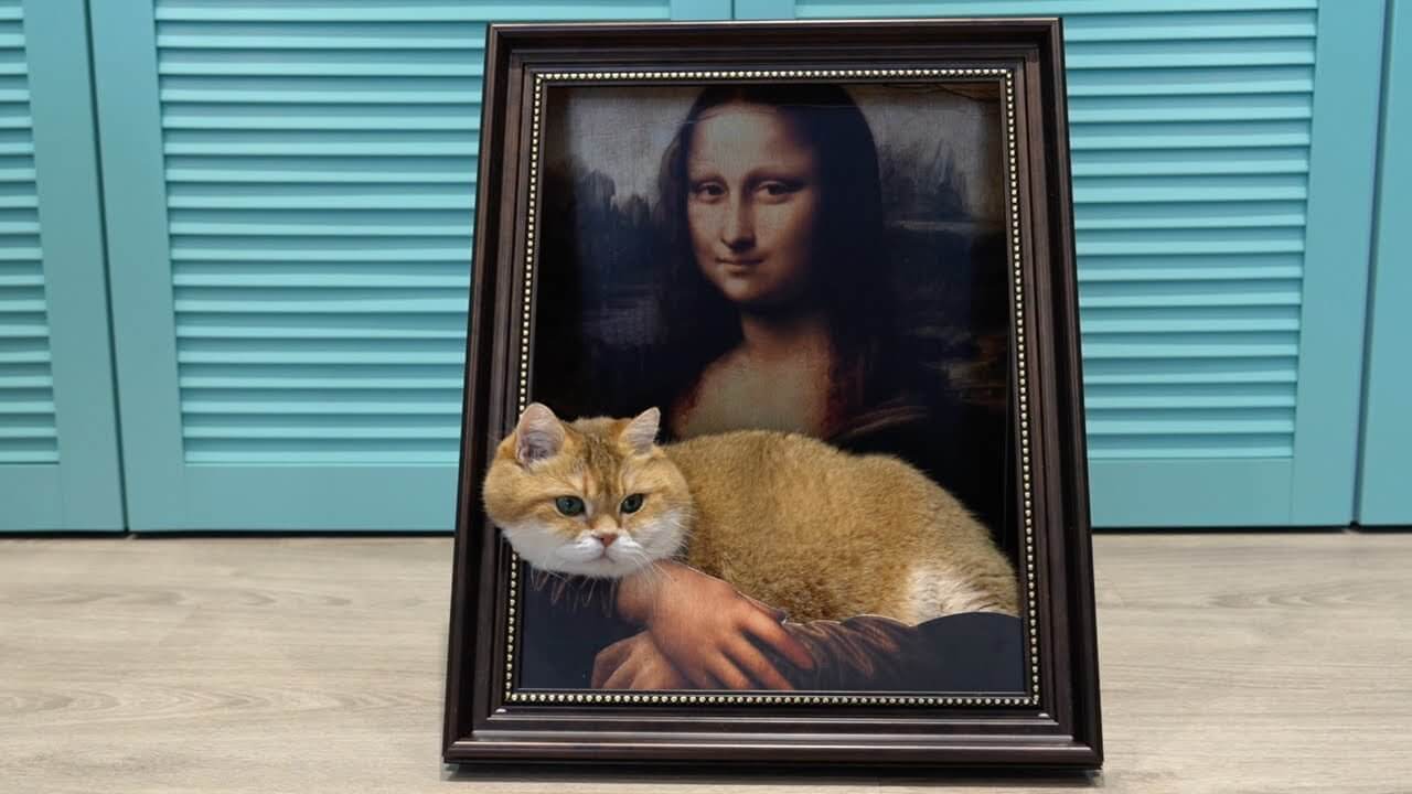 トラネコちゃんがモナリザの絵に顔を至近距離まで近づけて絵画を鑑賞している場面から始まります。