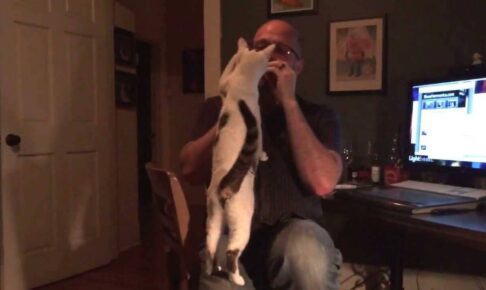 テンションが上がってハーモニカを演奏している飼い主さんに抱きつこうとしているブチ猫ちゃんのリアクションが可愛かったですし、ハーモニカの音色に合わせてブチ猫ちゃんがニャーンと鳴いているシーンがとても面白くて印象に残りました。