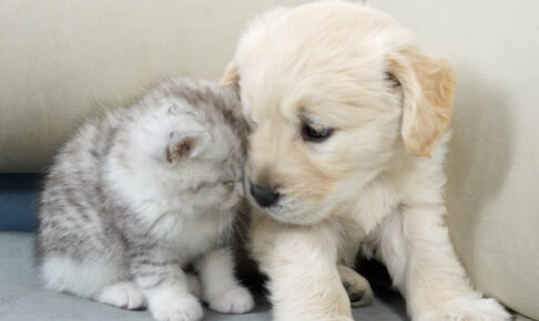 ゴールデンレトリバーの子犬が子猫のことをギュッと背後からハグして精一杯の愛情を示しています。