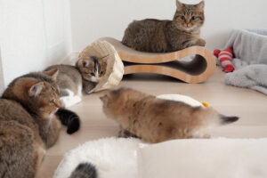 キッチンに立っているお母さんの足元にも攻めてきてミルクを早くちょうだいと急かしてくる子猫たちです。