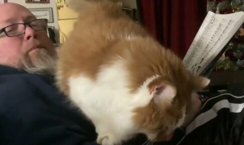 お父さんもババと向き合って可愛い顔を眺めながらゴキゲンそうにしています。猫と一緒にくつろぐリラックスタイムは極上の時間となりますね。
