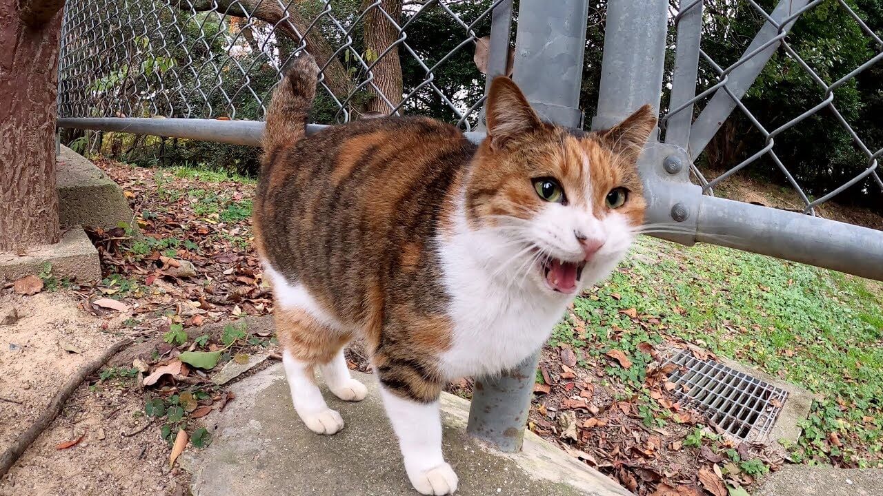 公園でむっちりボディの三毛猫さんが可愛い声で鳴きながら主さんのことを歓迎してくれているようです。なかなかの美猫ちゃんですがハスキーボイスなところもチャームポイントです。