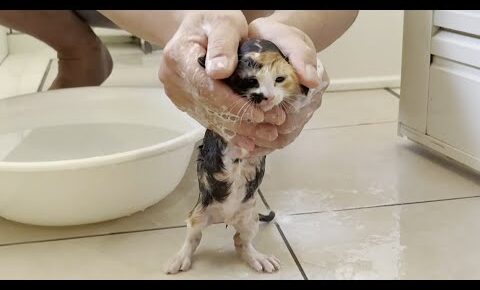 まずキジトラの子猫が初めてのお風呂です。最初は戸惑っているようでしたが案外おとなしく飼い主さんに洗われています。
