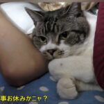 ワンコもニャンコが何度も繰り返しスリスリしてくるので、かなり戸惑っているような表情をしています。