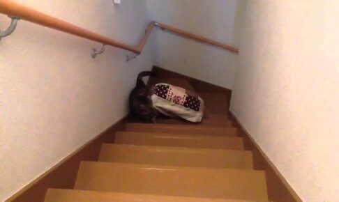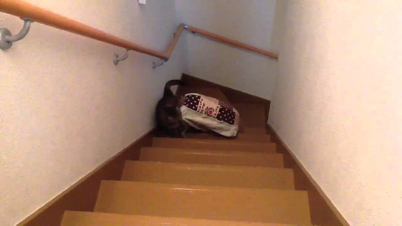 飼い主さんが階段を上がっていると、トラキチちゃんがベッドを口に咥えながら器用に階段をのぼってきました。