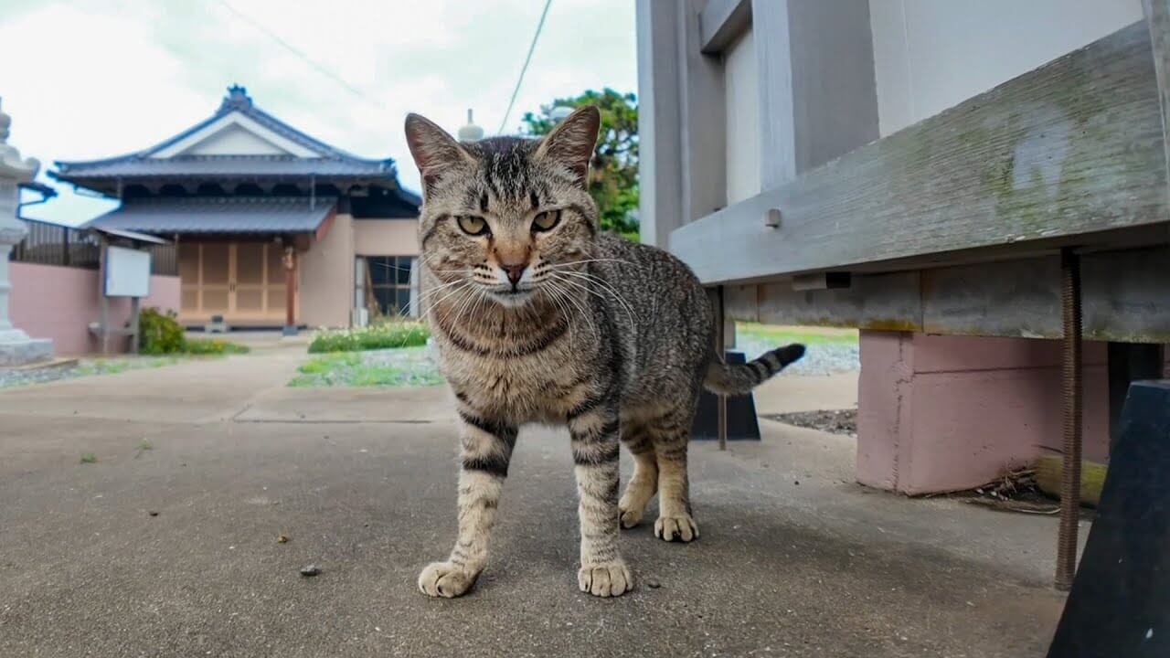 お寺の門の前で撮影しているとサバトラ猫ちゃんが人懐っこく近寄ってくる場面から始まります。