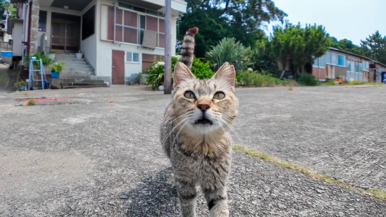 海辺の静かな港町で、一匹の人懐っこいキジトラ猫がまっすぐこちらに歩いてきます。