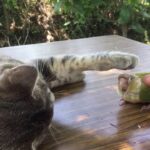 その後もう一匹の先住猫秀吉くんがやってくるも、こちらも豆大福同様に物陰からじ~っと子猫ちゃんをガン見。