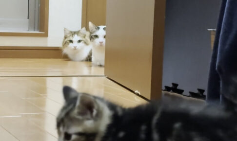 今回ご紹介するのは新入り子猫ちゃんを遠くからじ~っと見つめる先住猫達です。