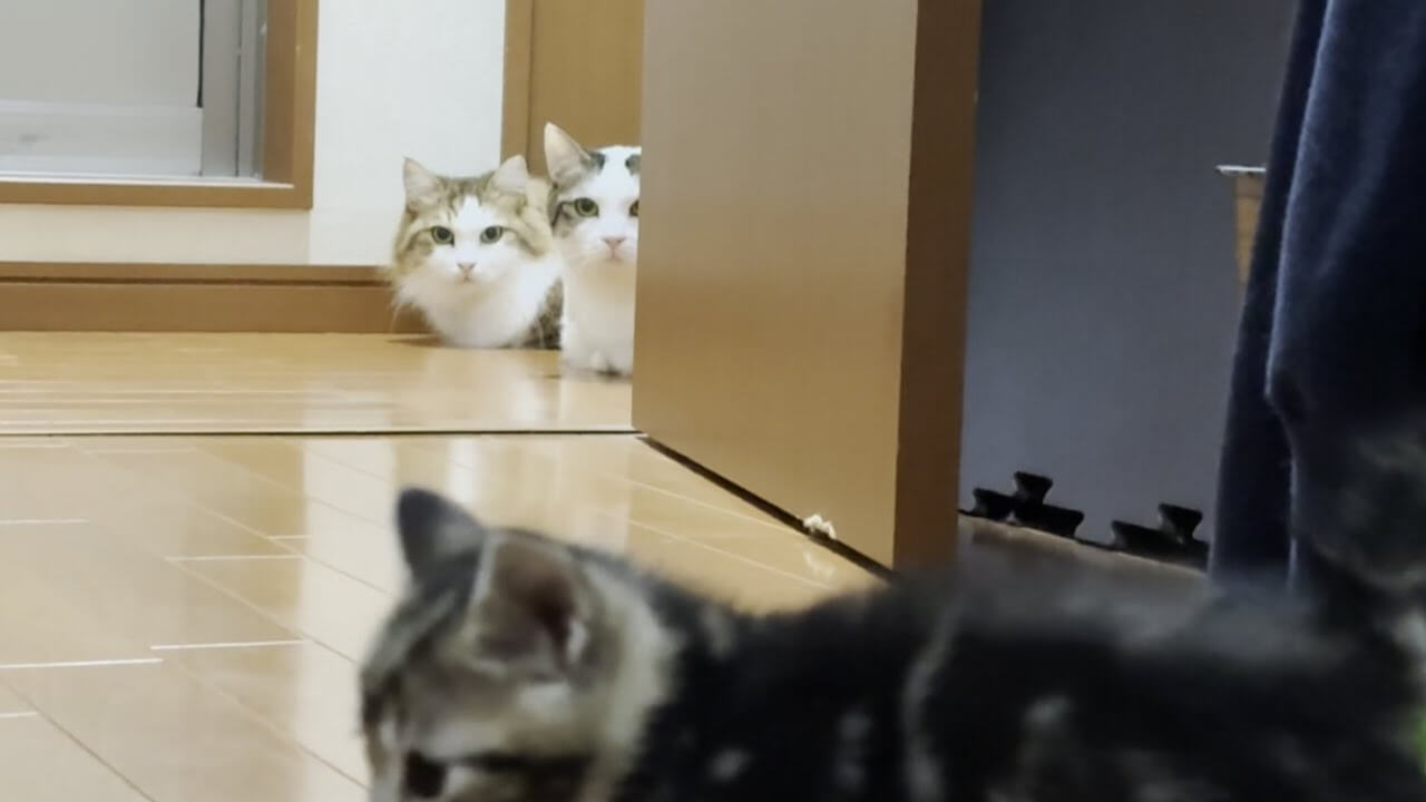 慎重に物陰から子猫ちゃんを見つめる姿が愛らしい先住猫達でした。