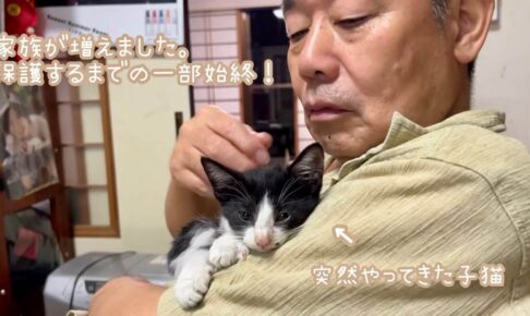 一度は警戒して逃げた子猫ですが、しばらくすると再び戻ってきます。先住猫のみーこが外に出て優しく子猫を家の中へと誘導。そのおかげで無事に保護することに成功しました。