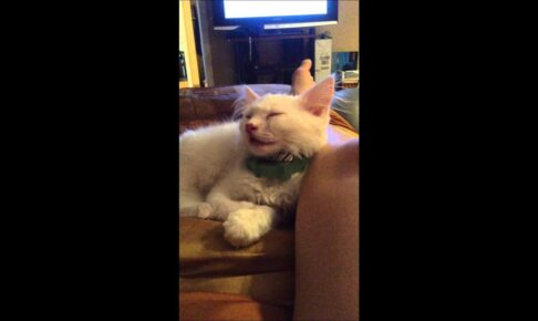 テレビを見ている飼い主さんも、そんな子猫の可愛すぎる寝落ちのタイミングを目撃できて、とっても嬉しそうです。子猫の寝顔ほどしあわせが詰まっているものはありません。