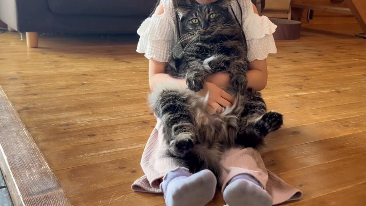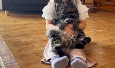 こんなに膝の上でリラックスしている猫さんは、警戒心も全くなく心から次女ちゃんのことを信頼している様子です。