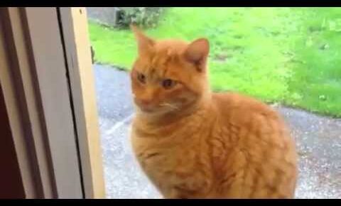 猫さんは再びほっぺたでベルを鳴らすとようやく飼い主さんがドアを開けてくれて無事に家の中に入ることができました。