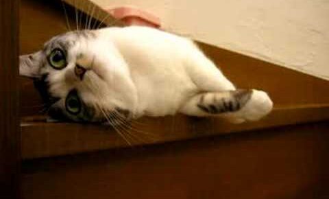 飼い主さんをじ~っと見つめ、お帰りニャ!と目で訴えながら階段でコロコロし続けます。
