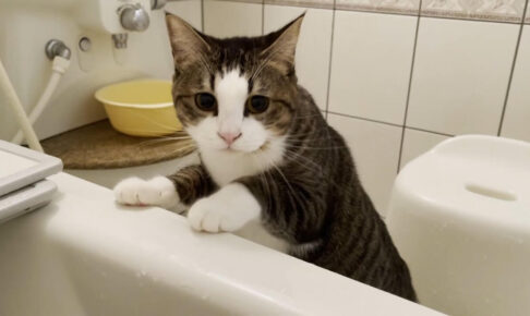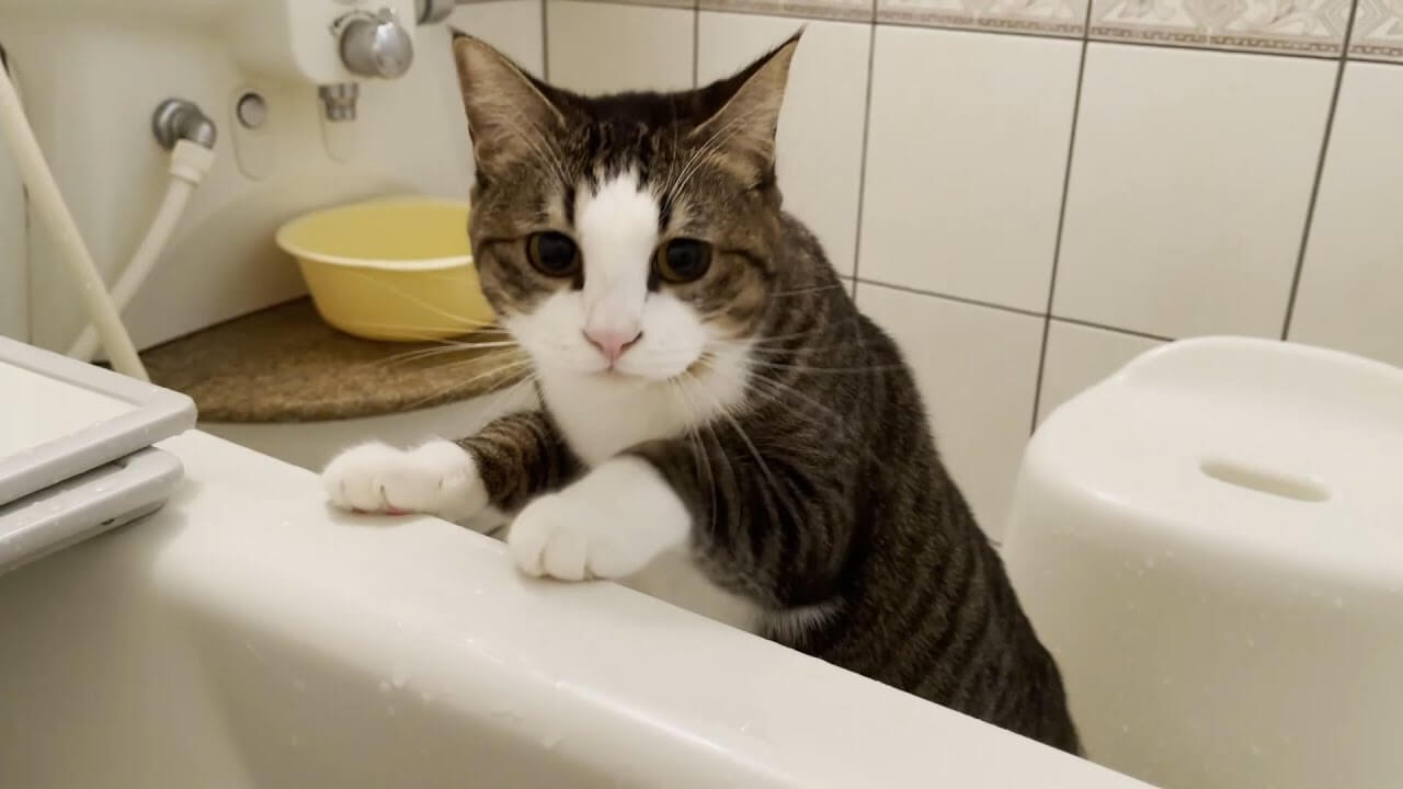 今回ご紹介するのは長風呂中のパパさんを心配する猫ちゃんです。