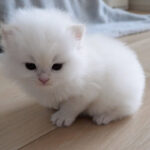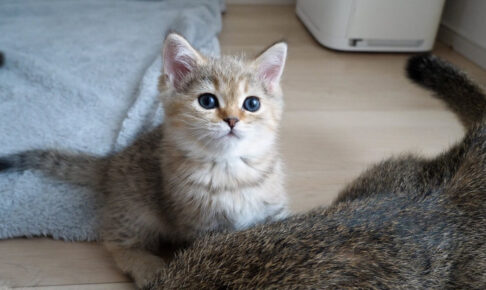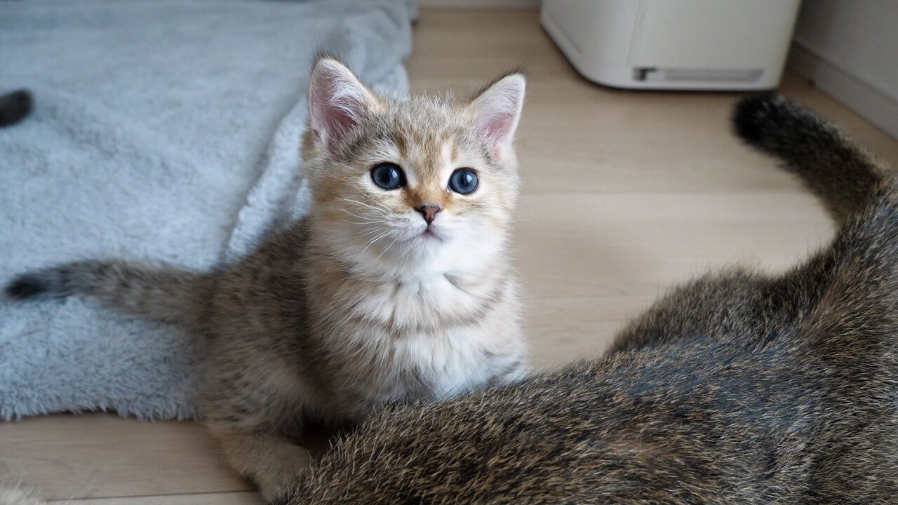 ですが肝心の相手の子猫はまだ爆睡状態のようです。そんな爆睡子猫の顔を見つめながら、起きないかにゃ〜と残念そうな表情をしています。ねぇねぇ、起きてにゃ〜一緒に遊ぼうにゃ〜。